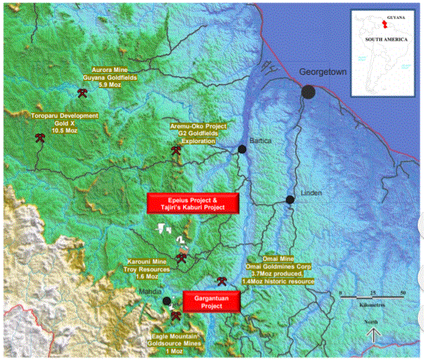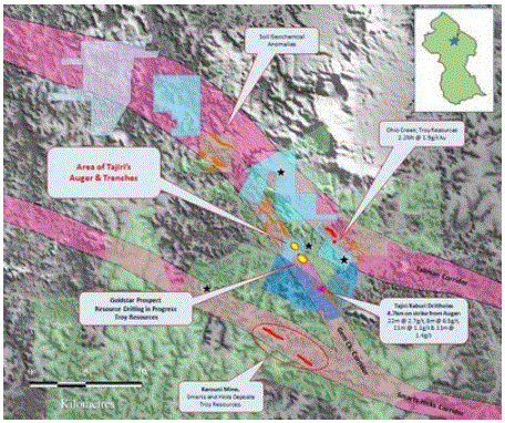 Epeius Gold Project is located 6 kilometres north of the Karouni Gold Mine operated by ASX listed Troy Resources Limited (ASX:TRY) and 600m from Troy's new Ohio Creek discovery. The Epeius Project is also contiguous with Tajiri's wholly owned Kaburi Property.