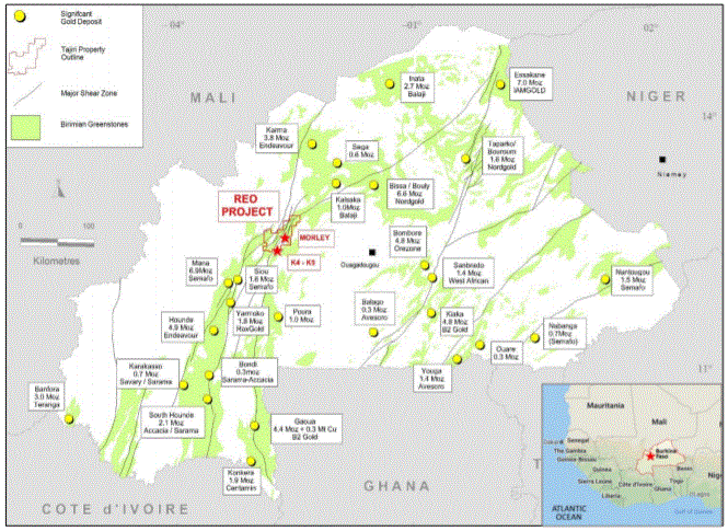 In Burkina Faso, Tajiri owns a 100% undivided interest in the Reo Project, which is a regional scale, advanced stage, gold exploration project covering 1,002 square km at the confluence of the prolific Houndé and Boromo greenstone belts which are hosts to several substantial gold deposits of including: Karma 3.8Moz (Endeavour Mining), Houndé 4.9Moz (Endeavour Mining), Mana 8.6Moz (Endeavour Mining) and Bissa 6.6Moz (NordGold) (reported inclusive of all P&P reserves and all M, I&I Resources).