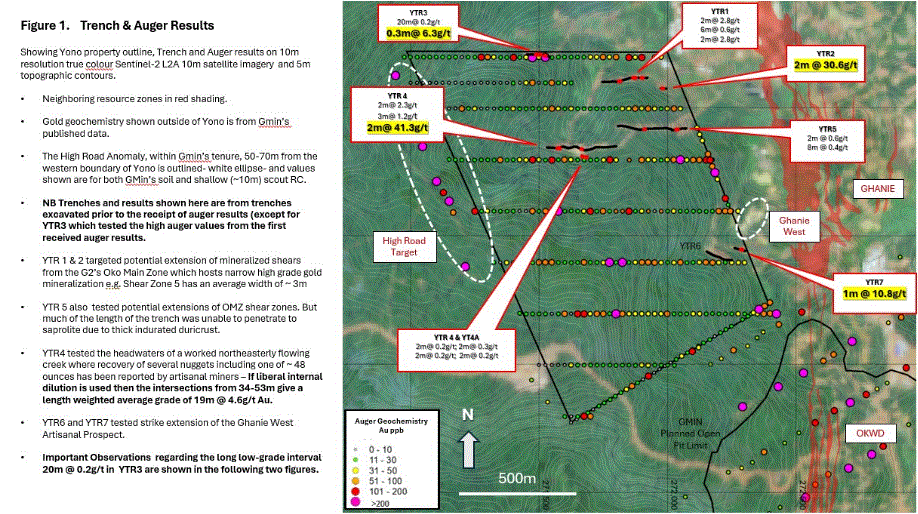 The airborne magnetic data from G Mining Ventures covering the entirety of Tajiri's Yono Property released in September 2025 identified high-priority targets, including the 1.5 km "High Road" magnetic low and structural contacts similar to those hosting nearby high-grade zones. In addition, the auger sampling in October 2025 has revealed widespread gold anomalism with peak values reaching 5.1 g/t Au, compares favourably to Oko West which has a peak soil value of ~2.8 g/t Au.