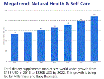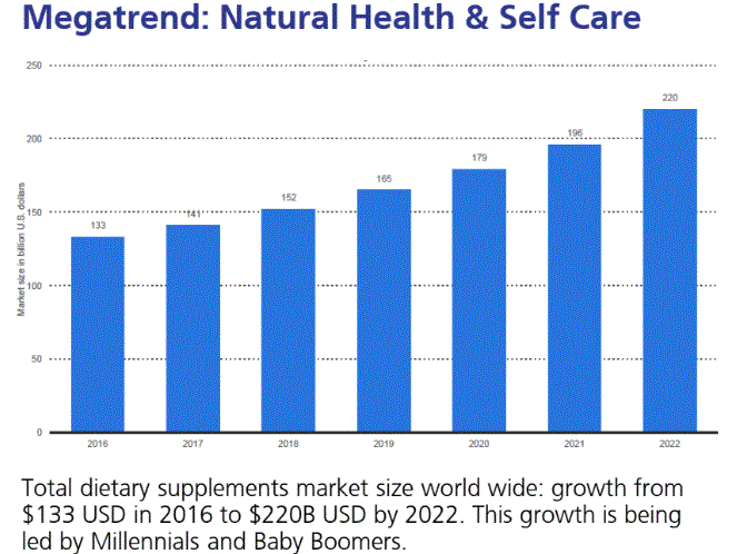 - Health is a Megatrend lead by Millennials, Boomers and emerging markets: global growth from US$133B (2016) is projected to be US$220B by 2022
