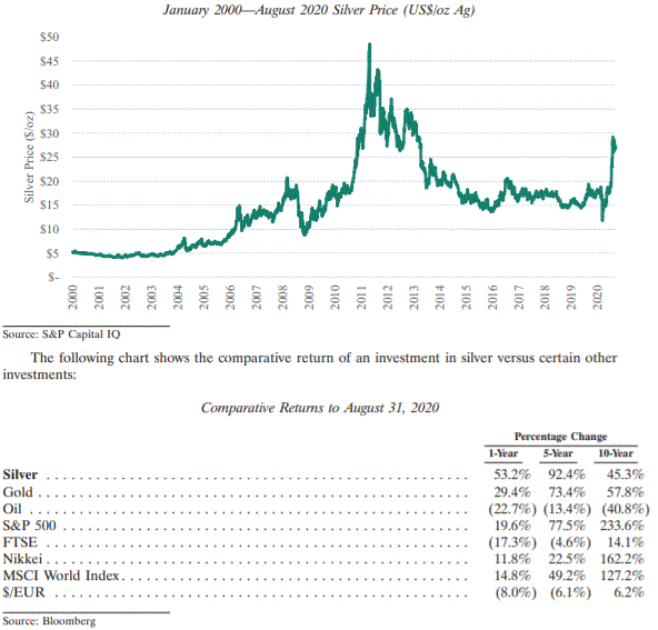 A chart indicating silver prices between January 1, 2000 and July 31, 2020 is set out below. As of