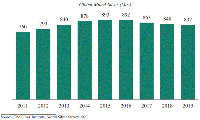ounces, up 0.06% from 2018). The chart below illustrates global mined silver production from 2011