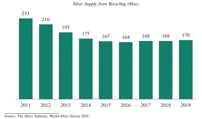 Institute's World Silver Survey 2020, accounted for 81.7% of supply in 2019. Recycling largely accounted